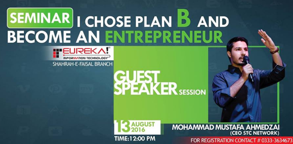 On 13th August, STCnetwork was invited for a motivational session at Eureka Institute which is a renown institute that offers certificates in English Learning and IT programs. I was invited by Abrar Khan who is the operations manager at Eureka. I had to speak on the topic: "I chose Plan B and became an Entrepreneur". I am not sure whether it was the excitement of independence month or something else, but this seminar turned out to be the most longest and yet memorable event of my life ever! I spoke for over 3.5 hours and this post will share important highlights of the event. This seminar also had one unexpected visitor that I will disclose later :)